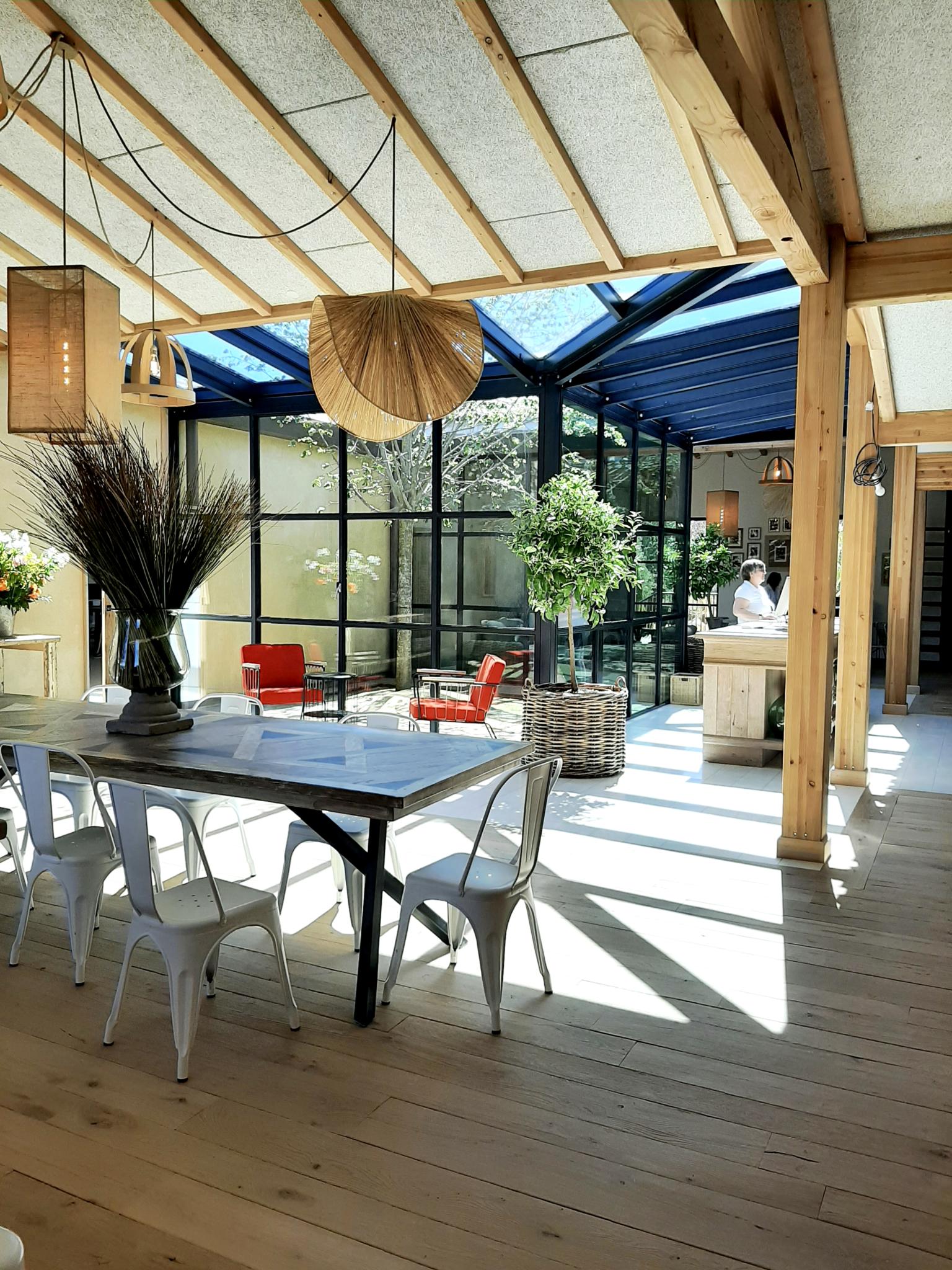 Passerelle d’accès, patio central arboré, verrière inaugurant un lounge de réception : autant de dispositifs architecturaux qui ouvre vers un accueil en slow-checking, nouveau standard du glamping haut de gamme.