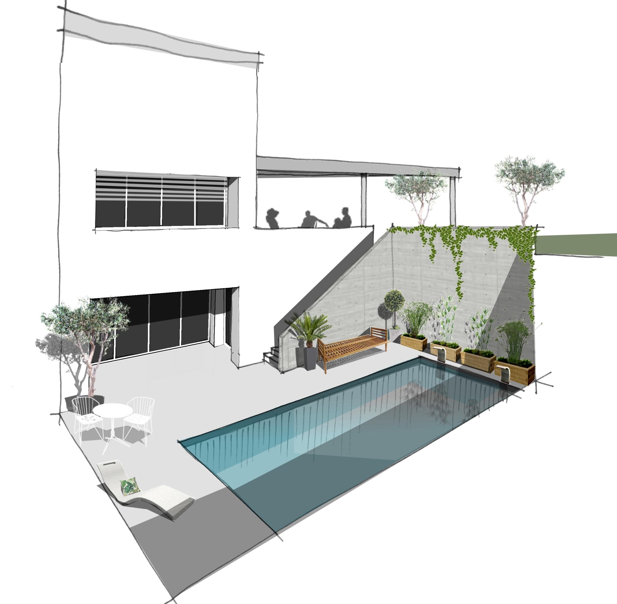 Le bâtiment se développe sur trois niveaux dont un en enterré avec une façade au Sud s’ouvrant au niveau de la la piscine avec une plage généreuse protégée en contre bas.